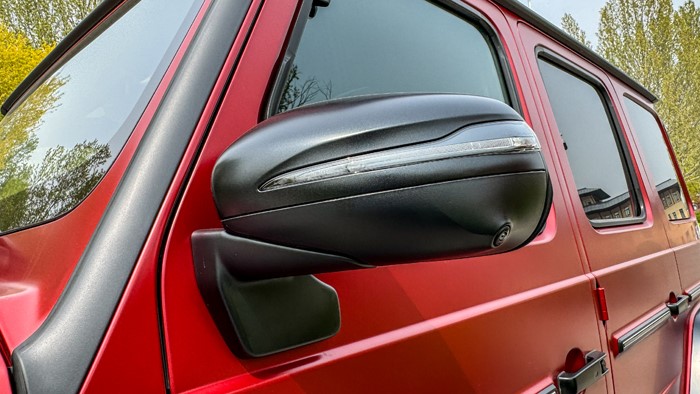 帶有暗夜套件的中網及前黑色保險杠形成了雙拼配色,非常明顯。從這一代奔馳G開始,奔馳G一直以來所堅持的“方正”造型演繹出了細微的變化,前保險杠不再是一條直線,兩側變得略微后掠。