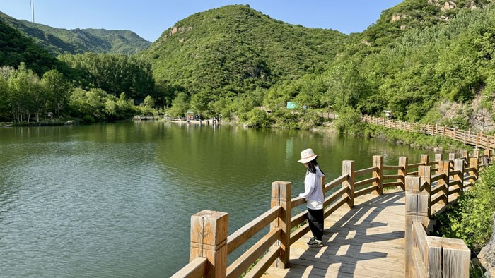 翻過小山,沿著木棧道走,就看到了小水庫,又是一片不一樣的風景。