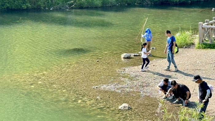 在水邊看到很多小蝌蚪,有的人玩水,有的人靜靜地發呆,大人孩子都找到了屬于自己的快樂。