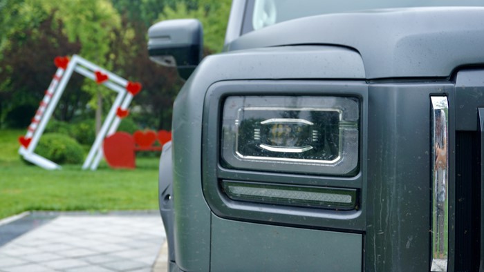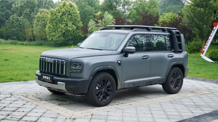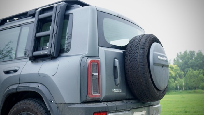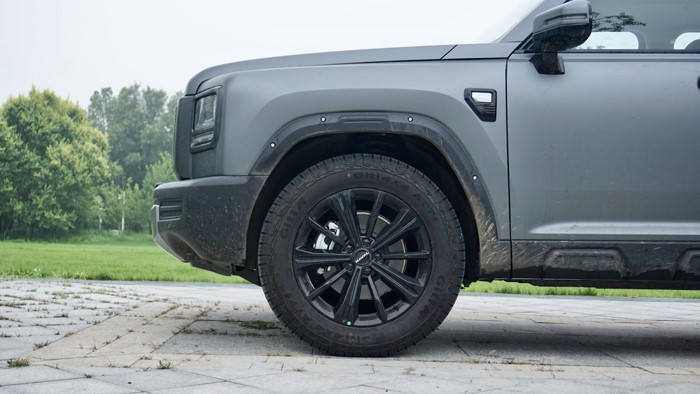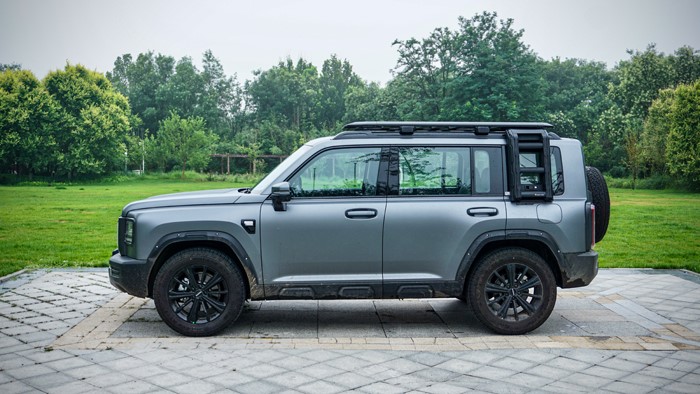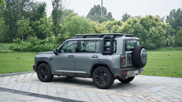 側面輪廓是典型的方盒子造型,車頂與尾部幾乎90度。車身高度適中,搭配粗獷的輪拱設計和大尺寸的輪胎,進一步增強了它的越野氣質。車輛的三圍數據:4800×1950×1822mm,軸距為2738mm,原配輪胎規格為245/60 R18,本車升級了255/60 R19的輪胎規格。