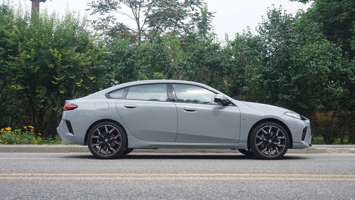 車身側(cè)面可以看出是一臺轎跑車的姿態(tài),很明顯的溜背短尾造型設(shè)計。國產(chǎn)寶馬2系的車身尺寸為4663*1801*1457mm,相比進(jìn)口版車型長度有所增長,軸距達(dá)到了2780毫米。該車輪胎規(guī)格為225/40 R19,雙拼色M運動輪轂造型還是十分動感的。