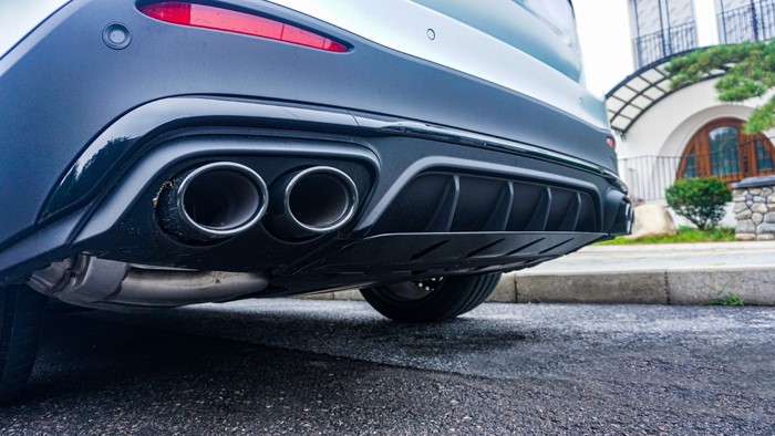 車型后部設計簡潔而精致,同樣是全面黑化處理。熏黑LED尾燈的設計使整個車尾更加立體感十足。后備箱非常平整,支持4/2/4分別放倒。后杠下方的空氣套件讓車看上去非常戰斗,另外車輛使用了雙邊雙出排氣。