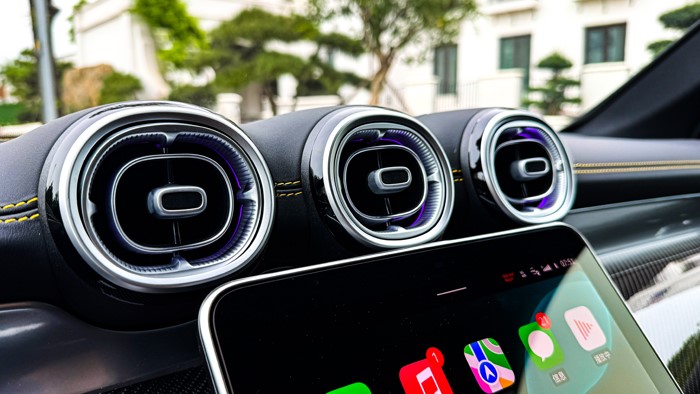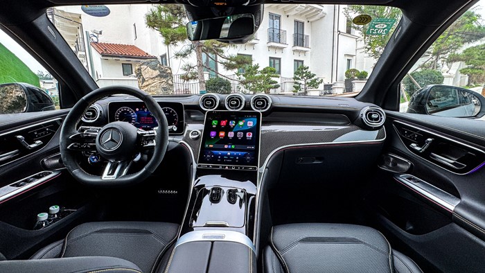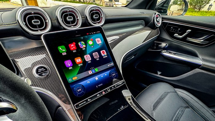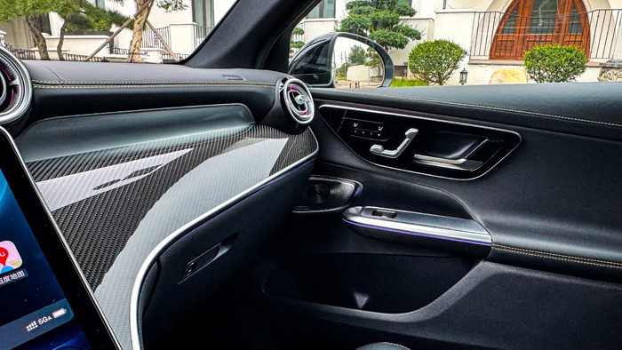 進入車內,奔馳2025款 AMG GLC 43 4MATIC的中控臺采用黑黃配色,加上碳纖維材質的運用讓視覺上感覺非常戰斗,細節方面的處理也顯示出大廠的功底。