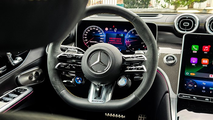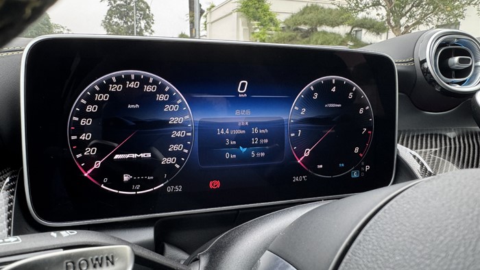 12.3英寸的儀表盤采用全液晶顯示屏,顯示清晰,操作簡便。AMG方向盤選用麂皮與真皮相拼的款式,黃色砸線非常凸顯運動感,握感也很舒適。方向盤上的快速切換單元方便駕駛者隨時轉成:戰斗模式。