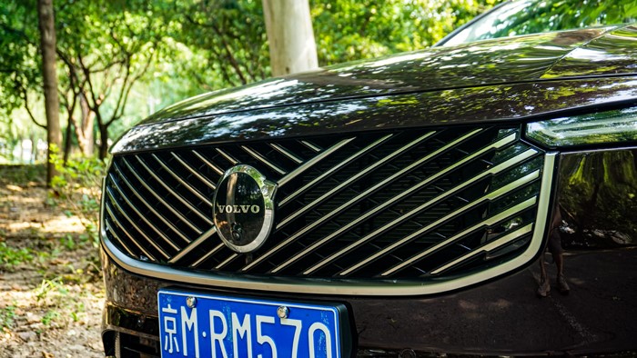 雷神之錘的大燈是沃爾沃家族的經典設計語言,中網格柵采用全新交匯的樣式,辨識度非常高。中網邊框采用極窄的風格,兩端與車頭大燈交匯,扁平化風格很明顯,也使車頭看上去更寬大了。總的來說新款S90的車頭看上去年輕了不少。