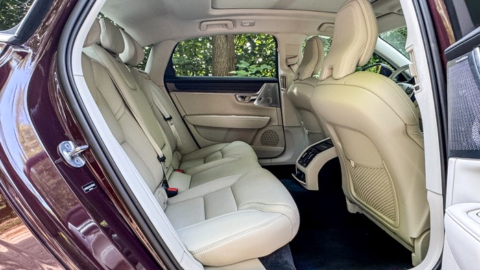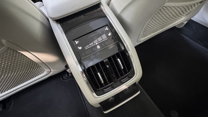 寬大舒適的后排座椅,軟硬度適中,不是坐上去塌陷的那種感覺,沃爾沃官方稱這樣的設計更適合長途駕駛,避免腰部過早疲勞。后排的腿部空間可以用奢侈來形容,一點也不為過。當然后排座椅也是帶有加熱和通風功能的。