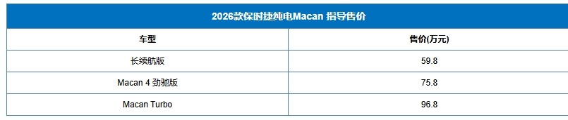近日,2026款保時捷純電Macan上市,共推出3款車型,售價區間59.8-96.8萬。
