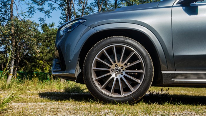 車輛使用了21寸的多條輻輪轂,輪胎為前后鴛鴦胎,靜肅性佳抓地表現也不錯。前輪胎規格均為275/45 R21,后輪胎為315/40 R21。
