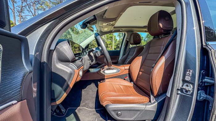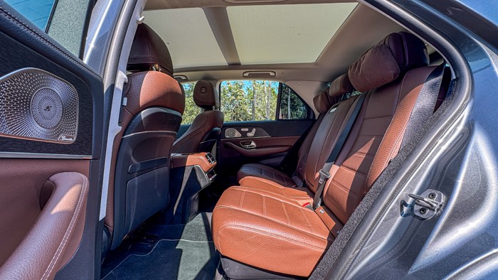 奔馳GLE450 4MATIC的座艙空間相對來說還是很寬敞的,寬大的運動座椅由高級真皮包覆,粗壯的側向支撐很有視覺沖擊力,座椅的舒適度性極好帶有電加熱功能。
