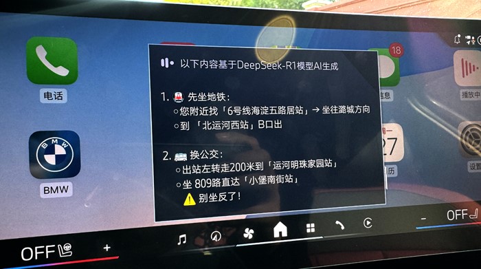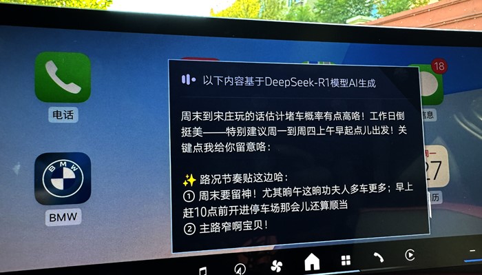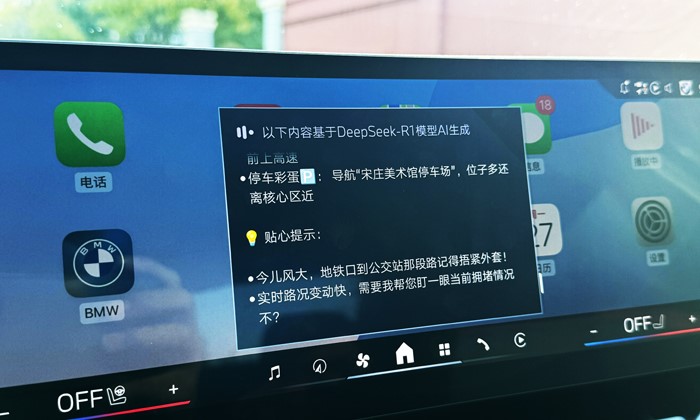 首先用語音喚醒寶馬車機(jī),開啟DeepSeek功能,你可以直接問關(guān)于宋莊畫家村的信息,相關(guān)信息會全部浮現(xiàn)在屏幕上。