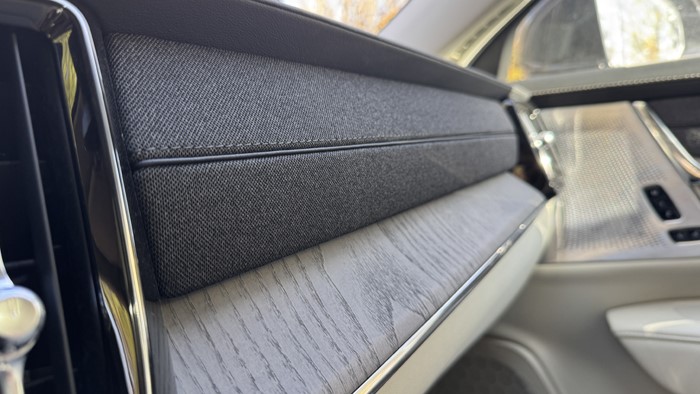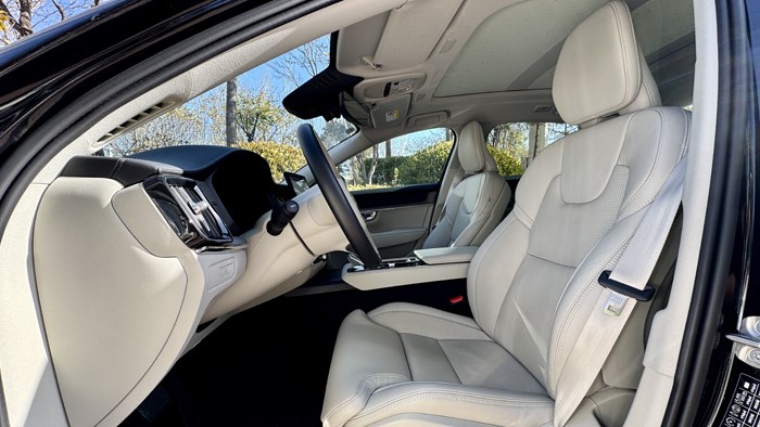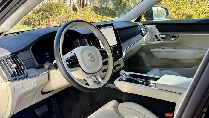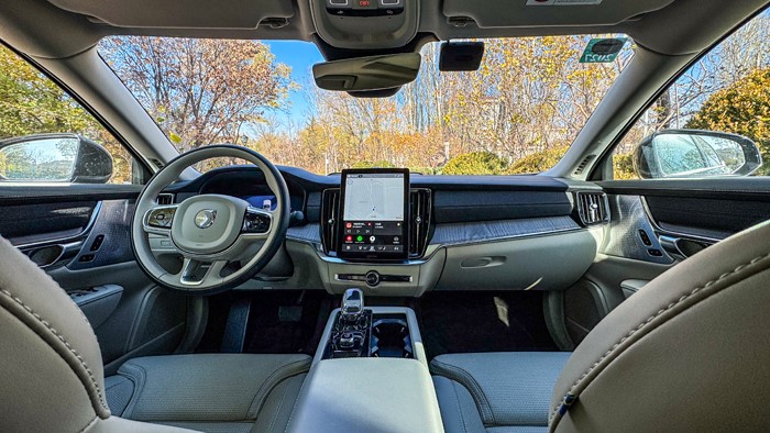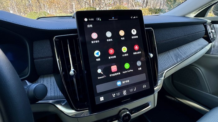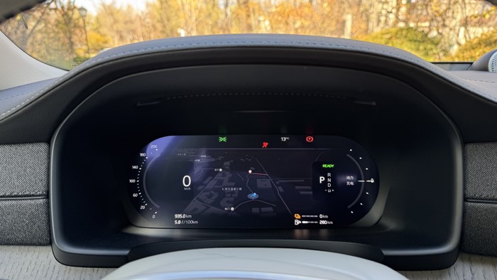這臺沃爾沃S90插電式混動使用了大量的金屬裝飾面板配合淺白色內飾,顯得簡約且豪華。12.3英寸全液晶儀表盤閱讀起來十分清晰。