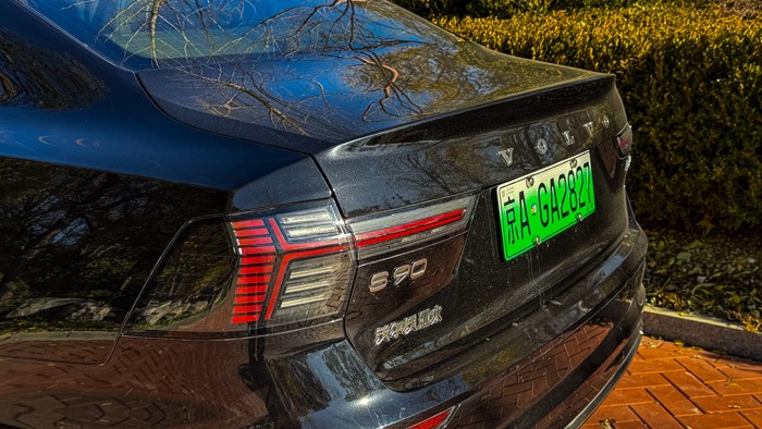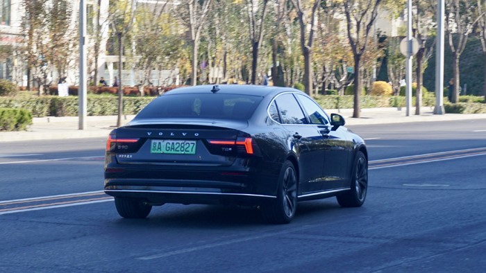 維京之斧造型的尾燈在夜晚很容易認出這是一臺沃爾沃S90。再說安全,沃爾沃S90的安全確實非同凡響:首先說車身安全方面。它采用比競爭對手更大的硼鋼材料,面積達到37.6%,這是以硼為主要合金化元素的鋼 ,其硬度可達到1,300~1,500Mpa,是一般車身鋼材硬度的4~5倍。在同等強度下,質量要輕15%。左前翼子板上的充電口證明這是臺插混車型。