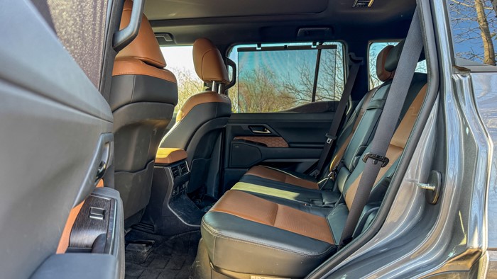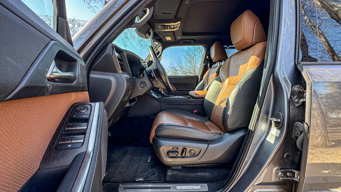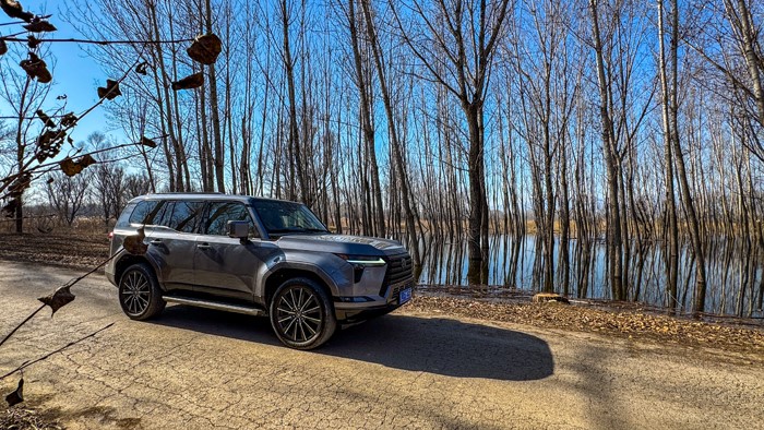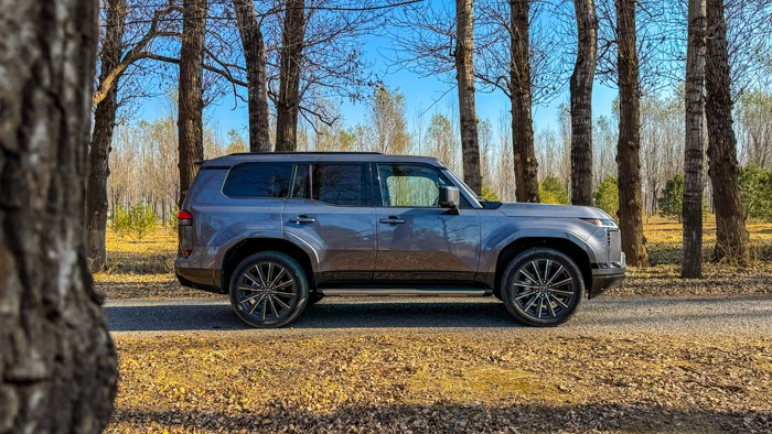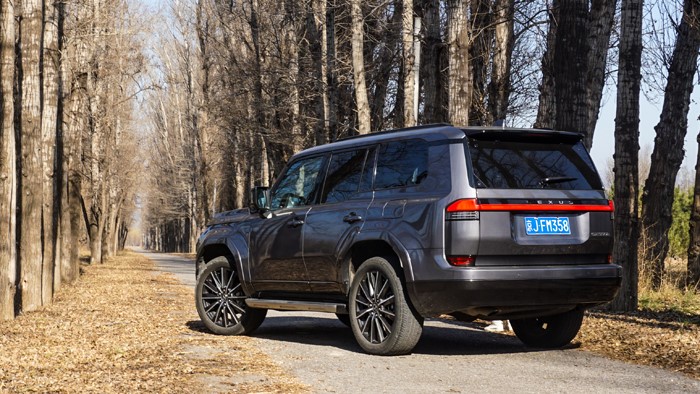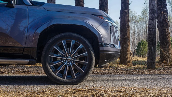 GX550h凌峰版使用了22寸輪轂,輪胎規(guī)格為265/50 R22,品牌為鄧祿普,作為一臺(tái)硬派越野車實(shí)屬不小。大尺寸的車輪增加了整體的視覺沖擊力,同時(shí)也提升了車輛的運(yùn)動(dòng)感和豪華感。為了上車方便,腳踏板也是原廠配置。