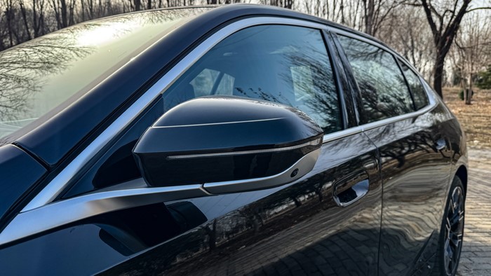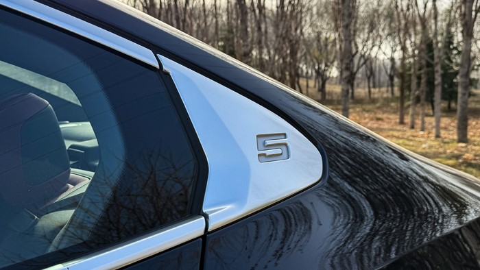 寶馬5系在C柱上鑲嵌了數(shù)字5的徽章,辨識度非常高,并且這個數(shù)字在夜晚是可以點亮的。