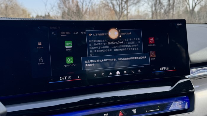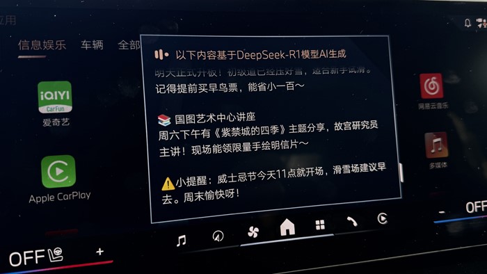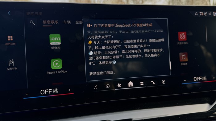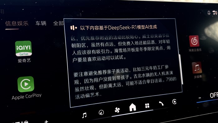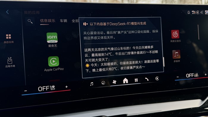 目前寶馬新增的DeepSeek功能還是很好玩的:用語音喚醒寶馬車機,開啟DeepSeek功能,你可以直接問關(guān)于想知道的信息,相關(guān)信息會全部浮現(xiàn)在屏幕上。例如這個周末北京有什么好玩的地方推薦、北京的天氣、有什么好吃的飯館推薦,甚至酒店、交通方式、停車等等信息。一些行程建議DeepSeek都會詳細的展示出來,并用語音直接為你解說。